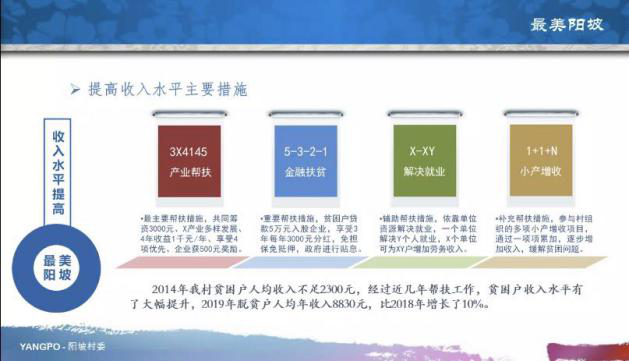 韩庚书记指出,北航在阳坡村的脱贫攻坚工作能取得巨大成效的关键因素在于领导充分重视、帮扶力量齐整、明确分工责任、思路清晰有效、贯彻落实有力以及标准规范统一。北航的曹淑敏书记、徐惠彬校长等领导都曾到阳坡村展开扶贫工作;韩庚书记等帮扶力量带领村名们发展产业集群,如小尾寒羊、林下鸡、种植小杂粮等等,增加村集体经济收益,帮助村民解决温饱问题;建立村级电子元器件加工点,采用北航“砣砣”工作法;由政府投资建设的光伏发电村级电站为广大村民提供公益性岗位。经过众多北航人近几年的帮扶工作,阳坡村的收入水平提高、贫困发生率下降、基础设施改善、生活品质提高、乡村环境美化、五大产业成型。贫困户收入水平大幅提升,2019年人均年收入8830元,比2018年增长了10%;2020年,阳坡村被确定为“吕梁市美丽宜居示范村”。